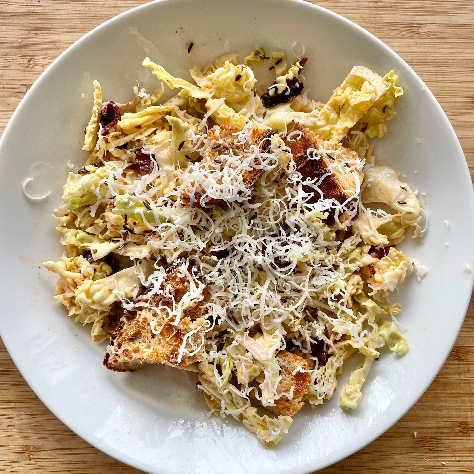 Trim, halve, and thinly slice 1 small Savoy cabbage (about 6 cups). Massage the cabbage ribbons vigorously, squishing and squeezing them in your hands to break it down a bit. Add to the bowl and toss to coat with the dressing. (At this point, the salad can sit very happily in the fridge for a few hours and even overnight.) Crumble in 2 of the crisped pastrami slices and add half the croutons; toss to combine. Divide between plates and top with the remaining croutons and any of the bits of cheese that melted onto the pan. Grate more gruyère over each salad. Crumble on the remaining pastrami. Gild the lily by toasting 2 tsp caraway seeds in a small frying pan and sprinkling them on top.